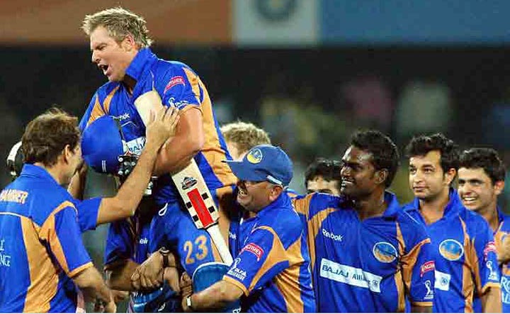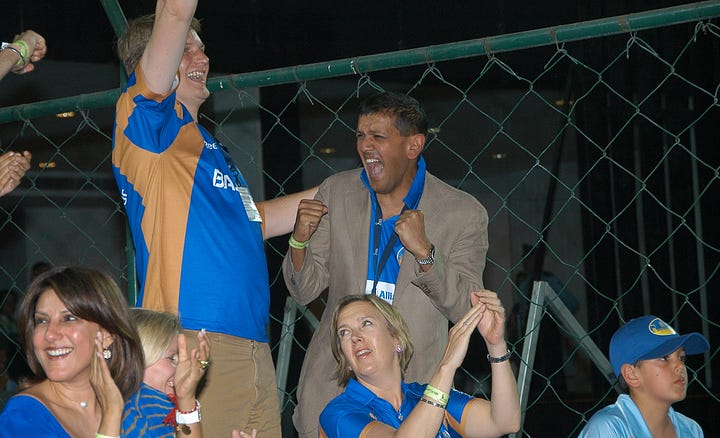In A New Innings, the book about the IPL and its massive influence on sport, that I wrote with Manoj Badale, the lead owner of the Rajasthan Royals (above), Badale recalls the experience. “First up in the auction was Shoaib Akhtar. Fifth was Shane Warne. No bids emerged as Richard Madley scanned the room. Just as he was about to declare the player unsold, we raised our paddle. Shane Warne. Sold to Team Jaipur. For his base price of $450,000. We had bought our first player in the IPL. Secretly I was nervous that no one else had bid. Next out was the biggest name of all the players in the auction – Mahendra Singh Dhoni. We knew he was going to be above our budget, so we sat back and watched the auction explode into life. $500k, $600k, $700k and then a million-dollar cricketer – Mumbai versus Bangalore versus Chennai – the biggest Indian families in open warfare – $1.1m, $1.3m and then finally $1.5m! We were shocked. We couldn’t believe that Chennai had spent close to a third of their salary cap on one single player. How wrong we all were. Ultimately he was worth every dollar.”