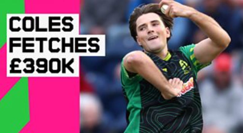 £390,000 for a month’s work for a 21-year-old cricketer who hasn’t yet played an international match. James Coles won the golden ticket at yesterday’s Hundred auction, as Dani Gibson did the day before with her £190,000 purchase by Sunrisers Leeds (though she is a full blown international.) Close on a £25m windfall has come into domestic cricketers’ (and agents’) pockets (augmented by some overseas players) as a result of the first player auction in English sport. And this in the month when Monty Panesar made his Test debut 20 years ago on a county salary of £12,000. As he says on the latest Analyst podcast. See also here.