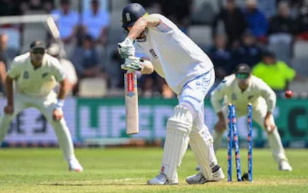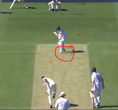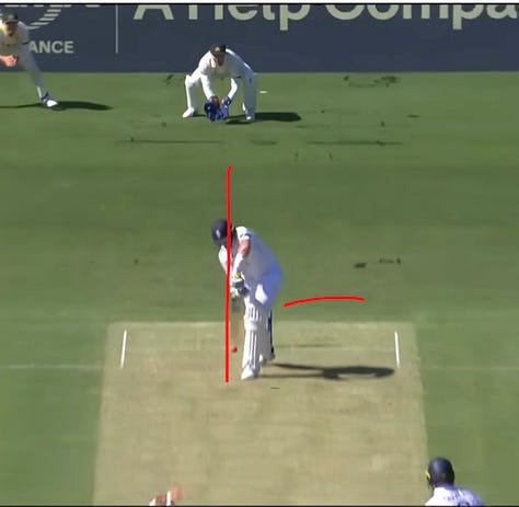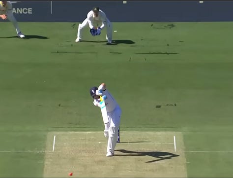 Matt Potts dismissed him twice the same way in that match. Notice how little his front foot has moved when struck, with barely any bend in the knee, suggesting his weight is in no-man’s land. Any experienced seamer will spy this with a glint in his eye and seek to bowl straight and on a full length. If it nips slightly one way of the other, he’s history. Matt Henry did him for a pastime in New Zealand, against whom he averaged 8.66 in three Tests the winter before last. And who are England’s Test opponents in June….?!